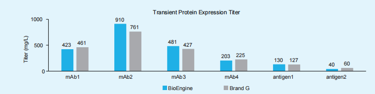在不同的单抗或抗原表达案例中,使用RapidTrans 293 瞬转表达试剂盒转染Expi293细胞,培养7-8天收获蛋白,结果显示mAb2表达量可达910mg/L,较进口品牌提升19.6%,其余案例的表达量中与进口品牌相当。