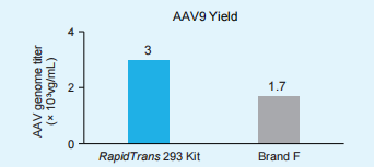 RapidTrans 293 Kit 的AAV9 产量达到 3 × 1013 vg/L,相较于 Brand F 培养基(1.7 × 1013 vg/L)产量提升 76%。