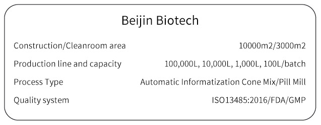 In the end of 2021, the Phase II culture media production base (Shanghai Beijin Biotech Co., Ltd) commenced full operation. This production base is an advanced factory that is built according to ISO13485:2016 quality management system, GMP, and MDSAP multi-system requirements, using the Lean Six Sigma (LSS) system for production management. The production base has realized the consistency amplification of the low-temperature CMPM (Cone Mixing/ Pin Mill) powder process at the level of 1,000 liters, 10,000 liters, and 100,000 liters, and the maximum production batch can reach 100,000 liters. The annual capacity of the powder medium is 55 million liters, and the annual capacity of the liquid medium is 250,000 liters. Our products meet the requirements of culture media for US FDA certification and EU product registration declaration and other related regulations.