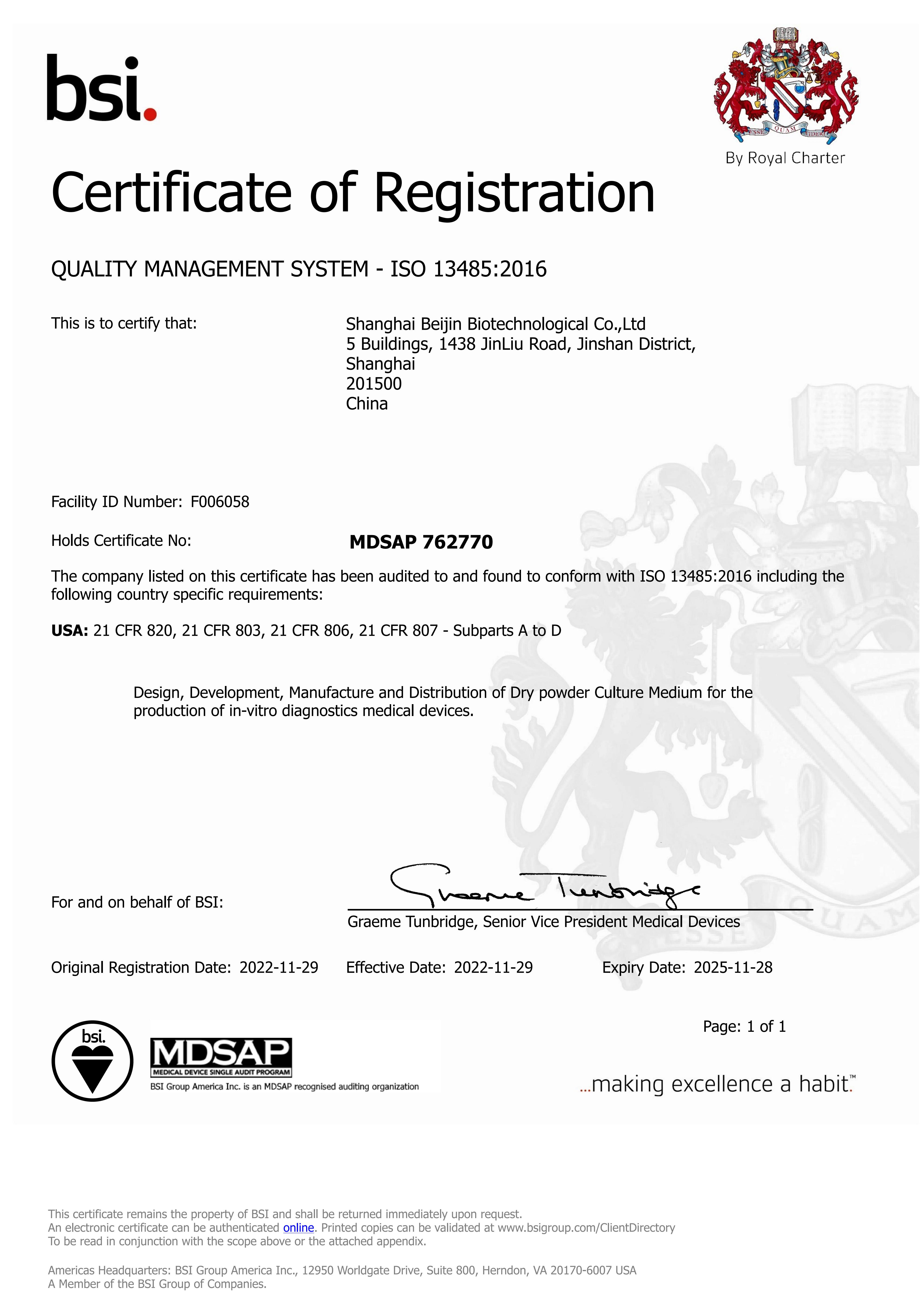 获得欧盟医疗器械权威机构(BSI) ISO 13485质量管理体系认证