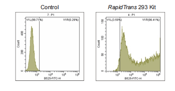 使用RapidTrans 293 瞬转表达试剂盒转染GFP后,流式结果显示转染效率为96.41% 。