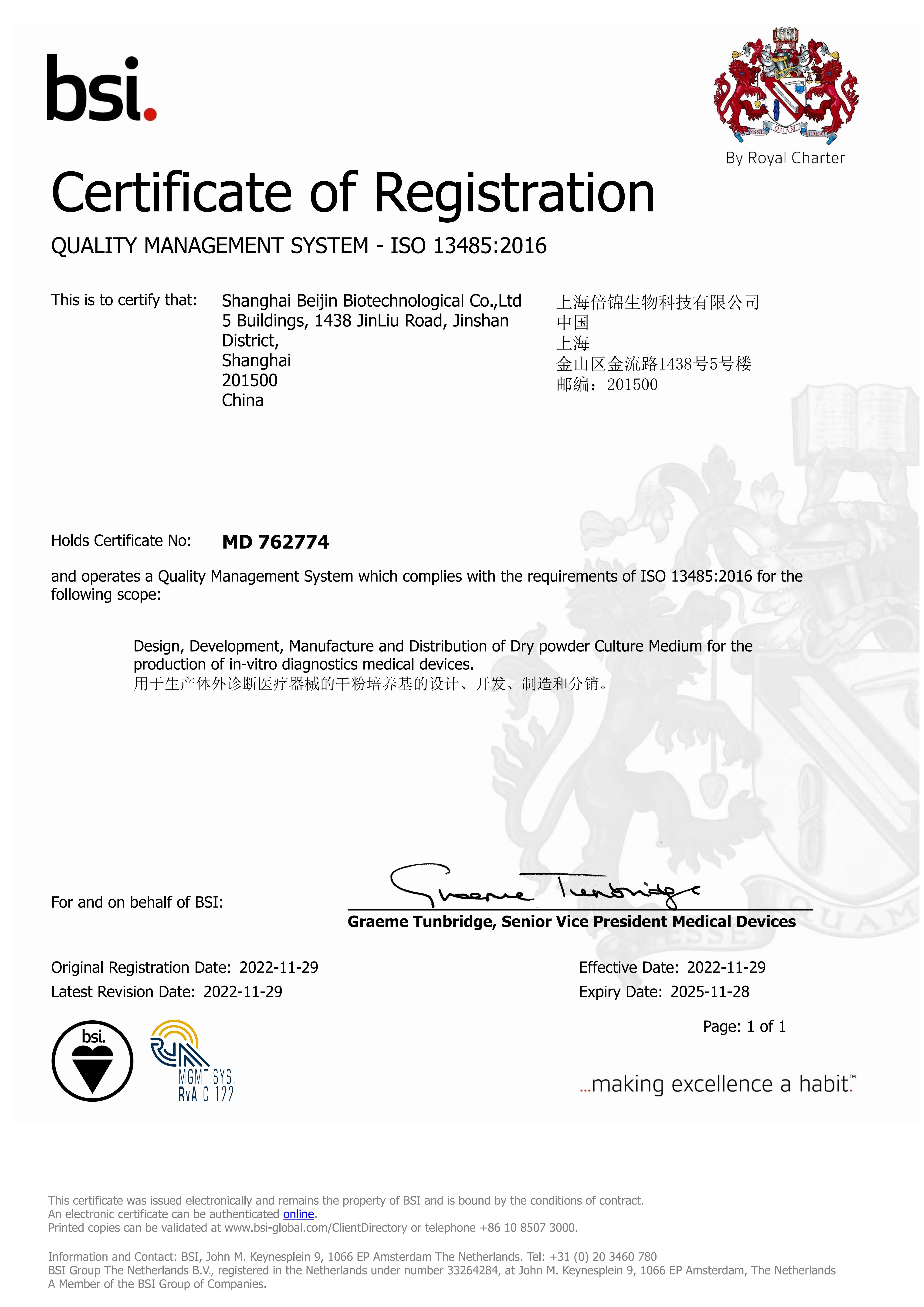 获得欧盟医疗器械权威机构(BSI) ISO 13485质量管理体系认证